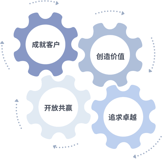 成就客户是一切决策的出发点,,创造价值是衡量所有工作的标准,,追求卓越是我们做事做人的态度,,,开放共赢是我们的格局也是最终的结果。。价值观的齿轮环环相扣,,,,推动着组织里的每个人不断向前。。
